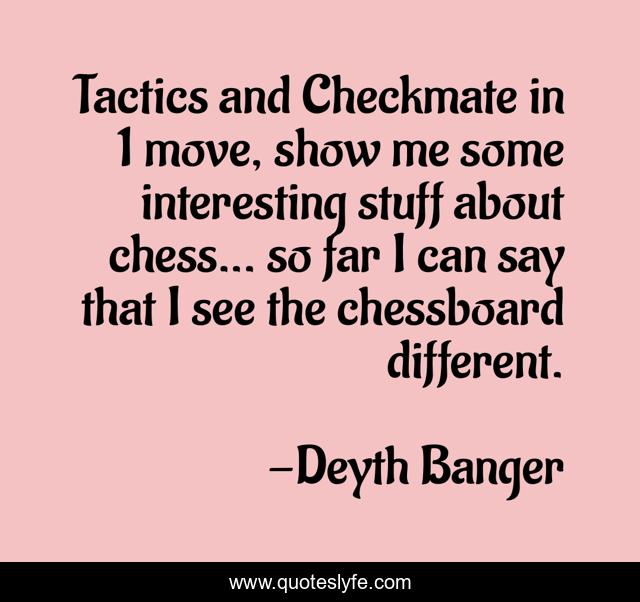 This page presents the quote "Tactics and Checkmate in 1 move, show me some interesting stuff about chess... so far I can say that I see the chessboard different.". Author of this quote is Deyth Banger. This quote is about seeing, different, tactics, move, 1, chess, checkmate,.