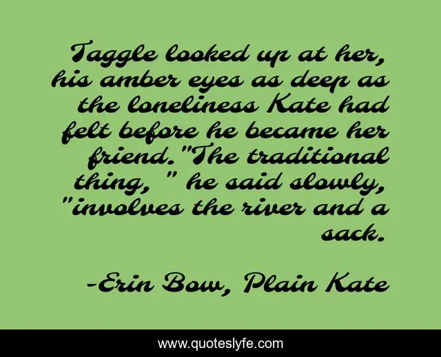 This page presents the quote "Taggle looked up at her, his amber eyes as deep as the loneliness Kate had felt before he became her friend."The traditional thing, " he said slowly, "involves the river and a sack.". Author of this quote is Erin Bow, Plain Kate. This quote is about death, love, talking-animals, sacrifice, friendship, affection,.