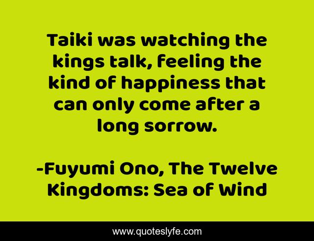This page presents the quote "Taiki was watching the kings talk, feeling the kind of happiness that can only come after a long sorrow.". Author of this quote is Fuyumi Ono, The Twelve Kingdoms: Sea of Wind. .