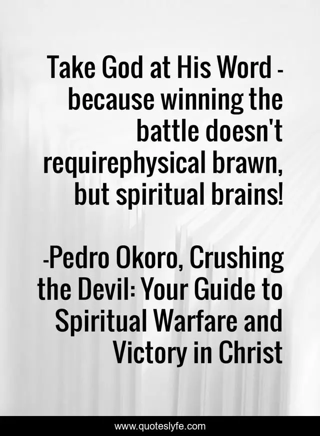 This page presents the quote "Take God at His Word – because winning the battle doesn't requirephysical brawn, but spiritual brains!". Author of this quote is Pedro Okoro, Crushing the Devil: Your Guide to Spiritual Warfare and Victory in Christ. This quote is about faith, spiritual-warfare, inspirational, enthusiasm,.