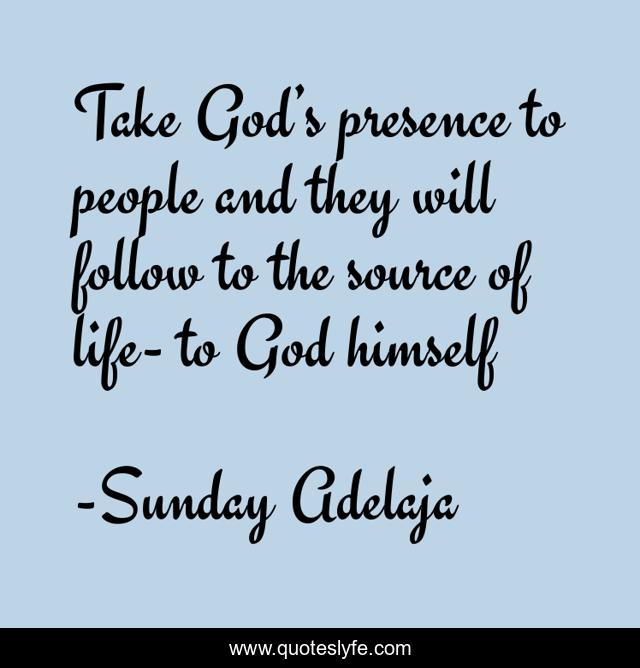 This page presents the quote "Take God’s presence to people and they will follow to the source of life- to God himself". Author of this quote is Sunday Adelaja. This quote is about source, people, presence,.