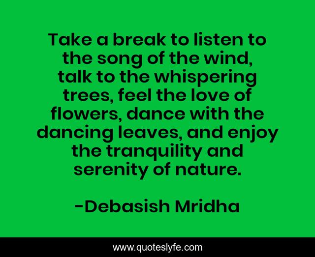 This page presents the quote "Take a break to listen to the song of the wind, talk to the whispering trees, feel the love of flowers, dance with the dancing leaves, and enjoy the tranquility and serenity of nature.". Author of this quote is Debasish Mridha. This quote is about song-of-the-wind, nature, serenity-of-nature, philosophy, debasish-mridha, debasish-mridha-m-d, quotes, inspirational, enthusiasm,.