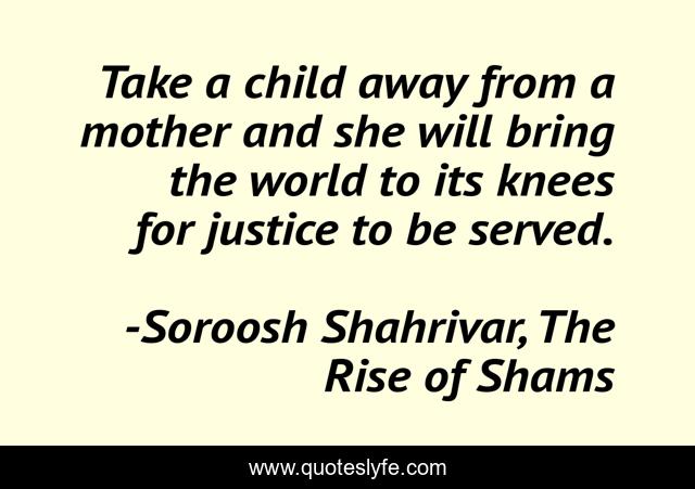 This page presents the quote "Take a child away from a mother and she will bring the world to its knees for justice to be served.". Author of this quote is Soroosh Shahrivar, The Rise of Shams. This quote is about justice, motherhood, child, mother,.