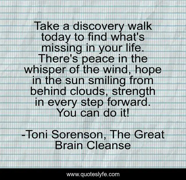 This page presents the quote "Take a discovery walk today to find what's missing in your life. There's peace in the whisper of the wind, hope in the sun smiling from behind clouds, strength in every step forward. You can do it!". Author of this quote is Toni Sorenson, The Great Brain Cleanse. This quote is about life, nature, motivation, walk, brain, thoughts, exercise,.