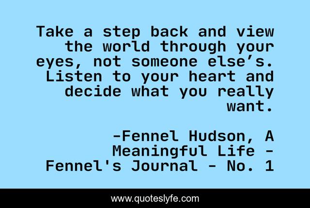 This page presents the quote "Take a step back and view the world through your eyes, not someone else’s. Listen to your heart and decide what you really want.". Author of this quote is Fennel Hudson, A Meaningful Life - Fennel's Journal - No. 1. This quote is about individuality, listen-to-your-heart,.