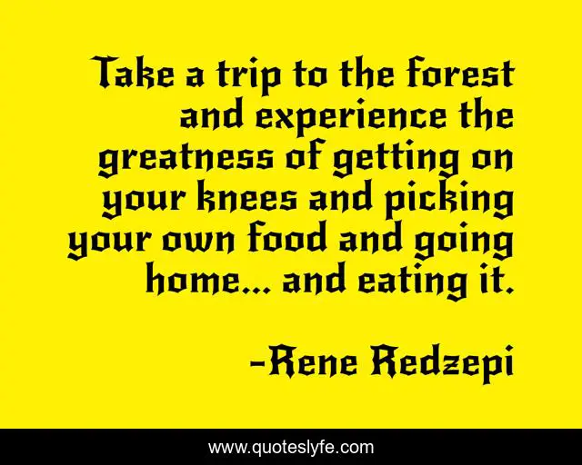 This page presents the quote "Take a trip to the forest and experience the greatness of getting on your knees and picking your own food and going home... and eating it.". Author of this quote is Rene Redzepi. This quote is about home, experience, greatness,.
