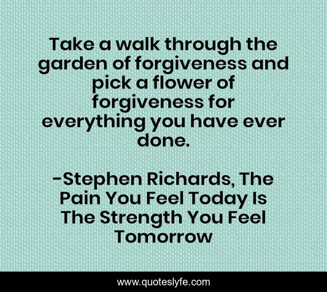 This page presents the quote "Take a walk through the garden of forgiveness and pick a flower of forgiveness for everything you have ever done.". Author of this quote is Stephen Richards, The Pain You Feel Today Is The Strength You Feel Tomorrow. This quote is about empowering, confidence, moving-on-and-letting-go, healing-the-past, motivational, forgive, stephen-richards-author, stephen-richards, suffering,.