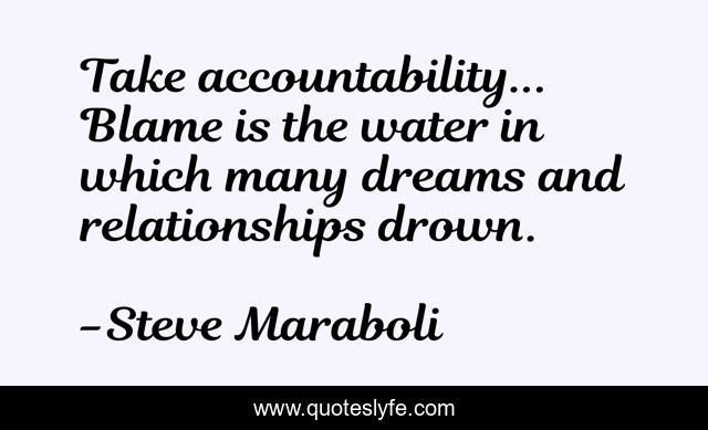 This page presents the quote "Take accountability... Blame is the water in which many dreams and relationships drown.". Author of this quote is Steve Maraboli. This quote is about blame, relationships, dreams, accountability,.