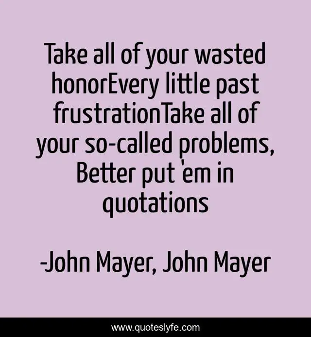 This page presents the quote "Take all of your wasted honorEvery little past frustrationTake all of your so-called problems, Better put 'em in quotations". Author of this quote is John Mayer, John Mayer. This quote is about life, continuum, lyrics, positive, motivational, confidence, experience, optimistic,.