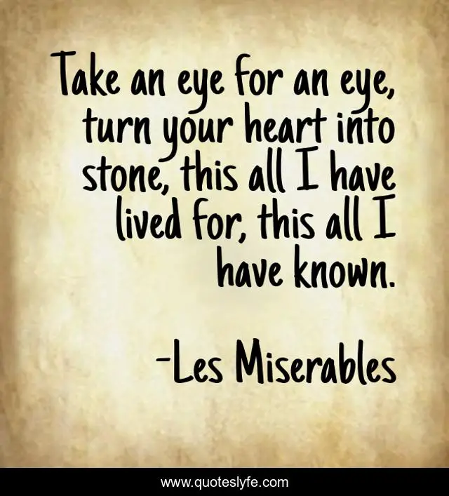 This page presents the quote "Take an eye for an eye, turn your heart into stone, this all I have lived for, this all I have known.". Author of this quote is Les Miserables. This quote is about feelings, enthusiasm, hiding, inspirational, secretive,.