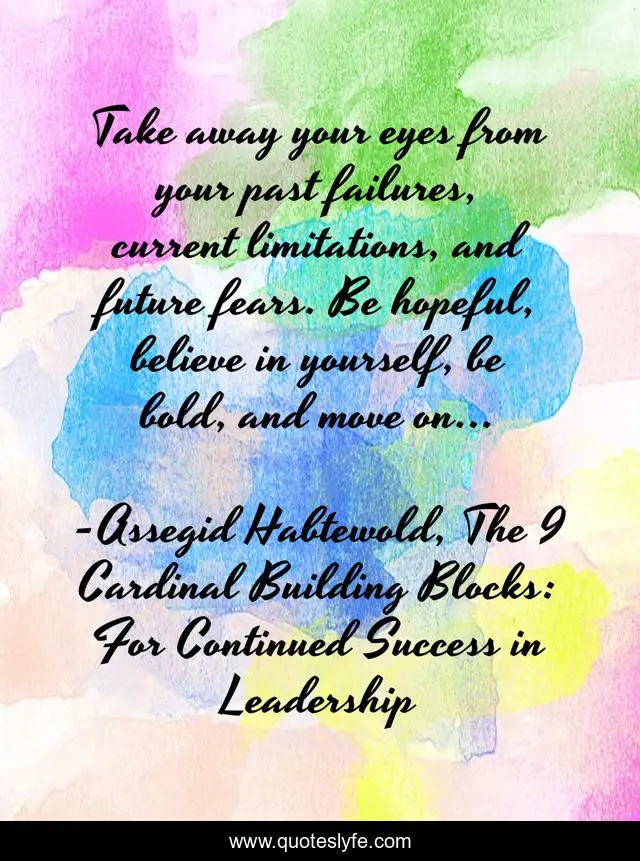 This page presents the quote "Take away your eyes from your past failures, current limitations, and future fears. Be hopeful, believe in yourself, be bold, and move on...". Author of this quote is Assegid Habtewold, The 9 Cardinal Building Blocks: For Continued Success in Leadership. This quote is about action, faith, courage, boldness, hope,.