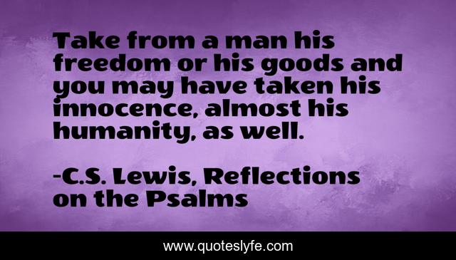 This page presents the quote "Take from a man his freedom or his goods and you may have taken his innocence, almost his humanity, as well.". Author of this quote is C.S. Lewis, Reflections on the Psalms. This quote is about justice, freedom, humanity, liberty,.
