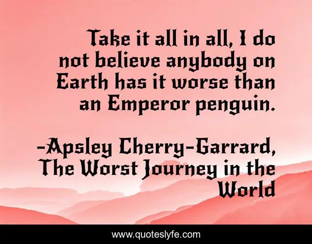 This page presents the quote "Take it all in all, I do not believe anybody on Earth has it worse than an Emperor penguin.". Author of this quote is Apsley Cherry-Garrard, The Worst Journey in the World. This quote is about polar-travel, antarctica, journey, adventure, ice,.