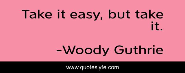This page presents the quote "Take it easy, but take it.". Author of this quote is Woody Guthrie. This quote is about philosophy, inspiration,.