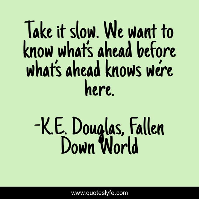 This page presents the quote "Take it slow. We want to know what’s ahead before what’s ahead knows we’re here.". Author of this quote is K.E. Douglas, Fallen Down World. This quote is about post-apocalyptic, young-adult,.