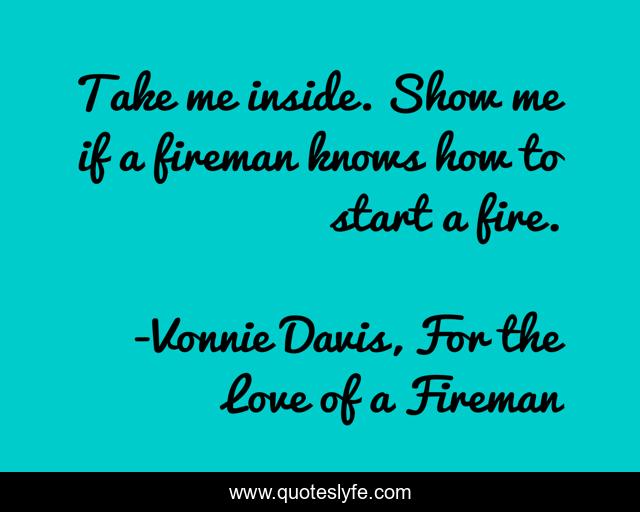 This page presents the quote "Take me inside. Show me if a fireman knows how to start a fire.". Author of this quote is Vonnie Davis, For the Love of a Fireman. This quote is about romance, firemen, suspense,.