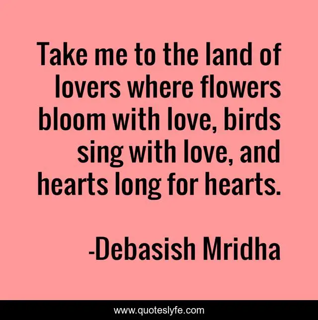 This page presents the quote "Take me to the land of lovers where flowers bloom with love, birds sing with love, and hearts long for hearts.". Author of this quote is Debasish Mridha. This quote is about birds-sing-with-love, love, land-of-lovers, philosophy, debasish-mridha, quotes, inspirational, hearts, enthusiasm,.