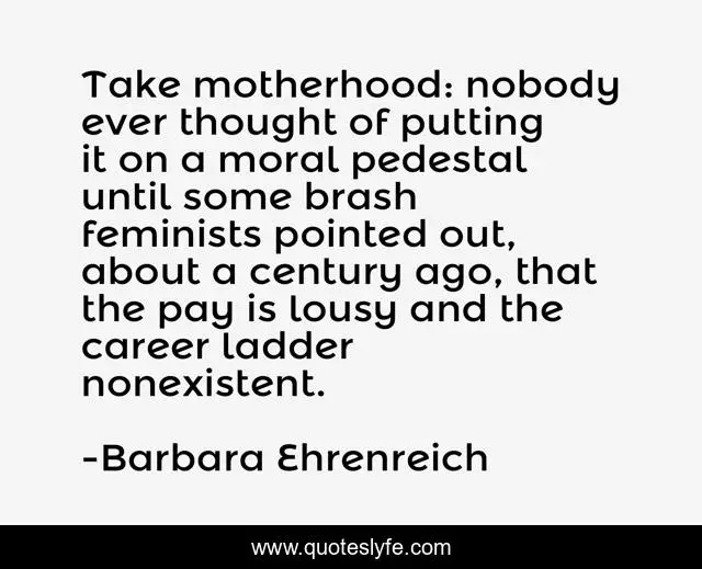 This page presents the quote "Take motherhood: nobody ever thought of putting it on a moral pedestal until some brash feminists pointed out, about a century ago, that the pay is lousy and the career ladder nonexistent.". Author of this quote is Barbara Ehrenreich. This quote is about thought, motherhood, moral,.