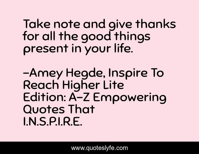 This page presents the quote "Take note and give thanks for all the good things present in your life.". Author of this quote is Amey Hegde, Inspire To Reach Higher Lite Edition: A-Z Empowering Quotes That I.N.S.P.I.R.E.. This quote is about gratitude, enthusiasm, inspirational,.
