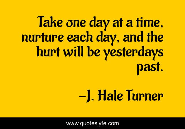 This page presents the quote "Take one day at a time, nurture each day, and the hurt will be yesterdays past.". Author of this quote is J. Hale Turner. This quote is about patience, healing, inspirational, enthusiasm,.