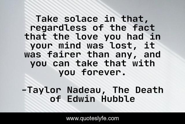 This page presents the quote "Take solace in that, regardless of the fact that the love you had in your mind was lost, it was fairer than any, and you can take that with you forever.". Author of this quote is Taylor Nadeau, The Death of Edwin Hubble. This quote is about loss, love, fair, edwin-hubble, comfort, affection,.