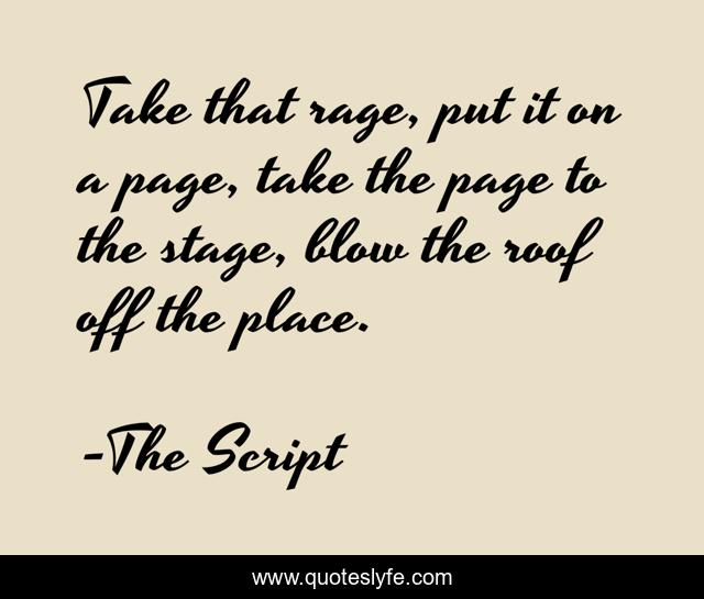 This page presents the quote "Take that rage, put it on a page, take the page to the stage, blow the roof off the place.". Author of this quote is The Script. This quote is about rage, writing, music, ireland, the-script, singing,.