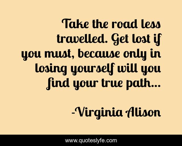 This page presents the quote "Take the road less travelled. Get lost if you must, because only in losing yourself will you find your true path...". Author of this quote is Virginia Alison. This quote is about find-yourself, less-travelled, lost, road, true-path,.