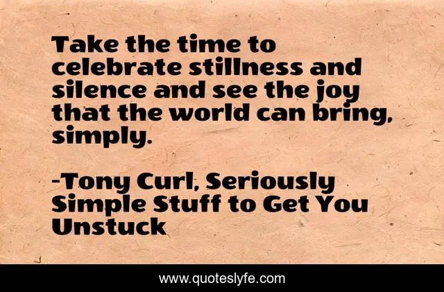 This page presents the quote "Take the time to celebrate stillness and silence and see the joy that the world can bring, simply.". Author of this quote is Tony Curl, Seriously Simple Stuff to Get You Unstuck. This quote is about silence-speaks, courage, celebration,.