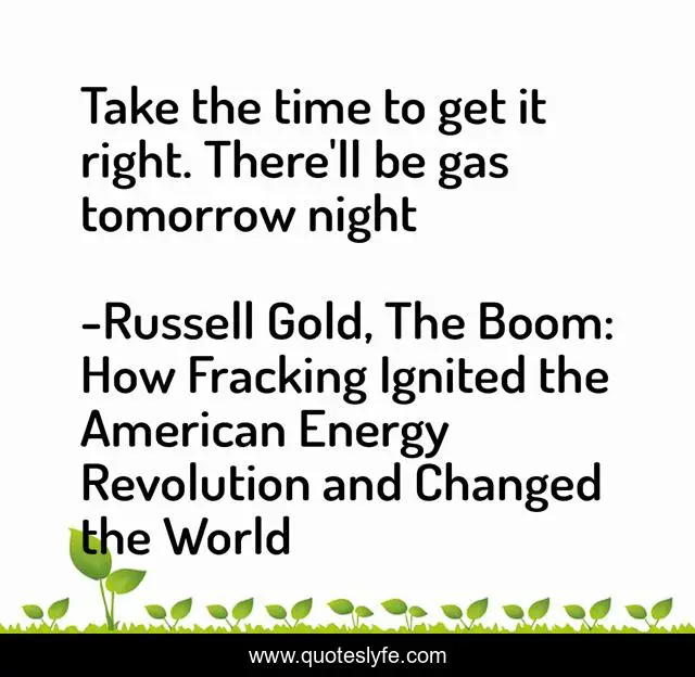 This page presents the quote "Take the time to get it right. There'll be gas tomorrow night". Author of this quote is Russell Gold, The Boom: How Fracking Ignited the American Energy Revolution and Changed the World. This quote is about environment, natural-gas, fracking,.