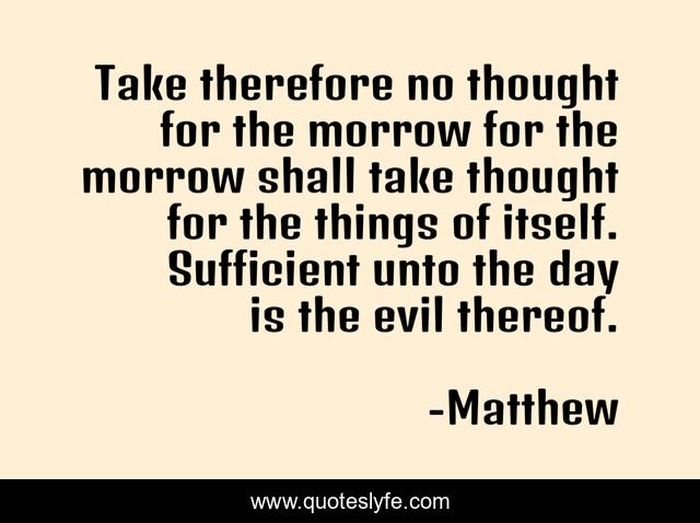This page presents the quote "Take therefore no thought for the morrow for the morrow shall take thought for the things of itself. Sufficient unto the day is the evil thereof.". Author of this quote is Matthew. .