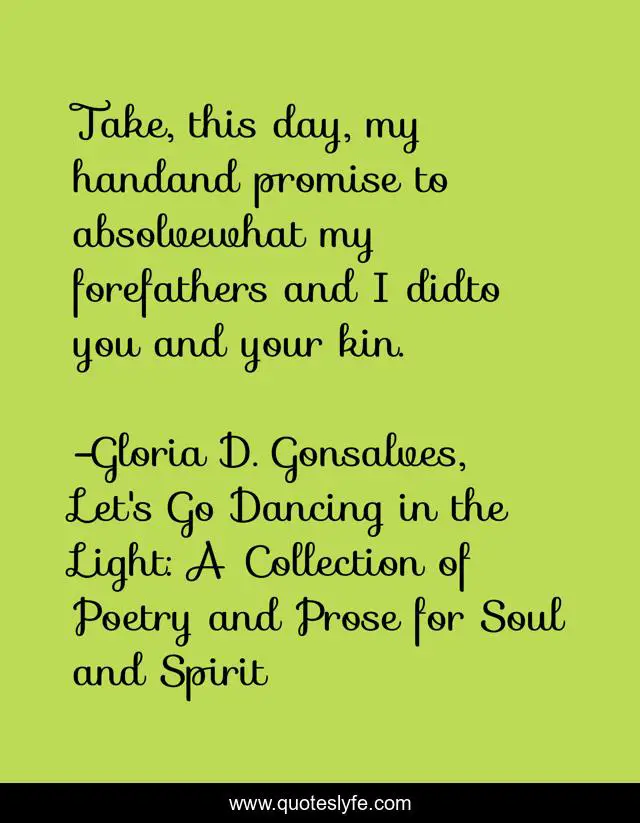 This page presents the quote "Take, this day, my handand promise to absolvewhat my forefathers and I didto you and your kin.". Author of this quote is Gloria D. Gonsalves, Let's Go Dancing in the Light: A Collection of Poetry and Prose for Soul and Spirit. This quote is about spirituality, enlightenment, forgiveness,.