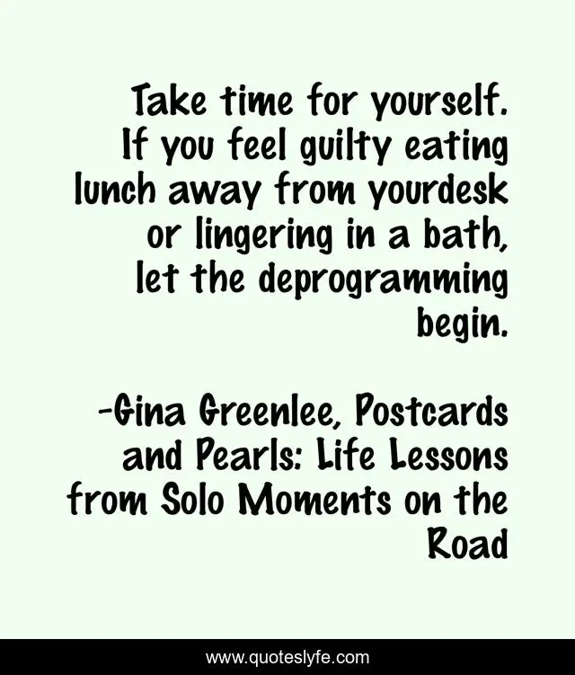 This page presents the quote "Take time for yourself. If you feel guilty eating lunch away from yourdesk or lingering in a bath, let the deprogramming begin.". Author of this quote is Gina Greenlee, Postcards and Pearls: Life Lessons from Solo Moments on the Road. This quote is about take-time, self-love, linger, time-for-yourself, being-vs-doing, inspirational, present-moment-living, enthusiasm, nurture-of-oneself,.