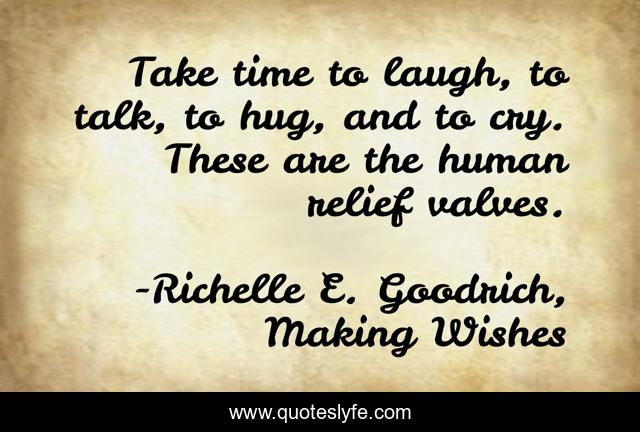 This page presents the quote "Take time to laugh, to talk, to hug, and to cry. These are the human relief valves.". Author of this quote is Richelle E. Goodrich, Making Wishes. This quote is about relief-valves, hug, richelle, richelle-e-goodrich, cry, human-emotions, laugh, richelle-goodrich, laughter,.
