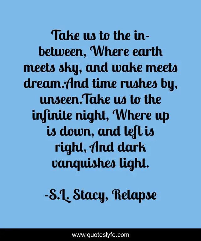 This page presents the quote "Take us to the in-between, Where earth meets sky, and wake meets dream.And time rushes by, unseen.Take us to the infinite night, Where up is down, and left is right, And dark vanquishes light.". Author of this quote is S.L. Stacy, Relapse. This quote is about greek-mythology, ritual, paranormal-romance, poetry,.