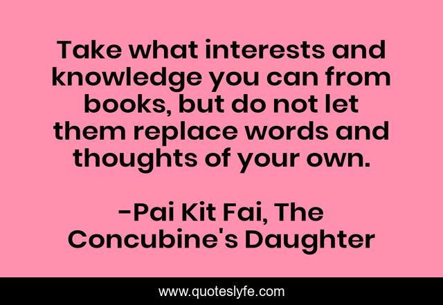 This page presents the quote "Take what interests and knowledge you can from books, but do not let them replace words and thoughts of your own.". Author of this quote is Pai Kit Fai, The Concubine's Daughter. This quote is about books, ideas,.