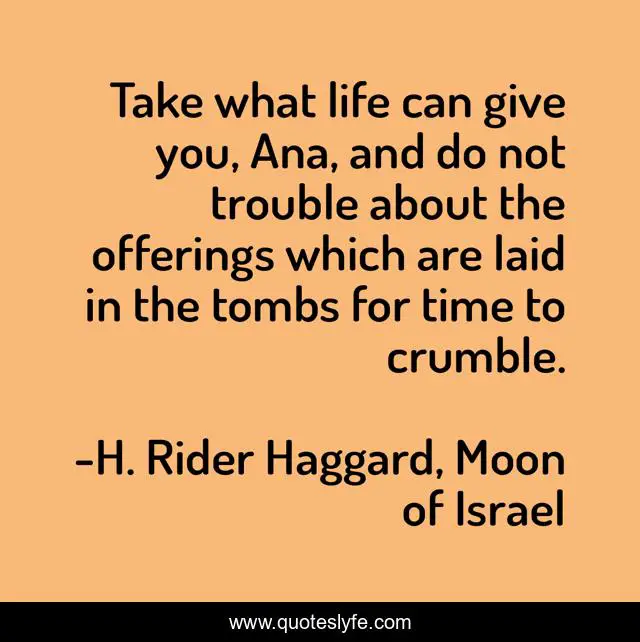 This page presents the quote "Take what life can give you, Ana, and do not trouble about the offerings which are laid in the tombs for time to crumble.". Author of this quote is H. Rider Haggard, Moon of Israel. This quote is about life-and-death, wisdom,.