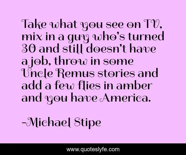 This page presents the quote "Take what you see on TV, mix in a guy who's turned 30 and still doesn't have a job, throw in some Uncle Remus stories and add a few flies in amber and you have America.". Author of this quote is Michael Stipe. This quote is about r-e-m, america,.