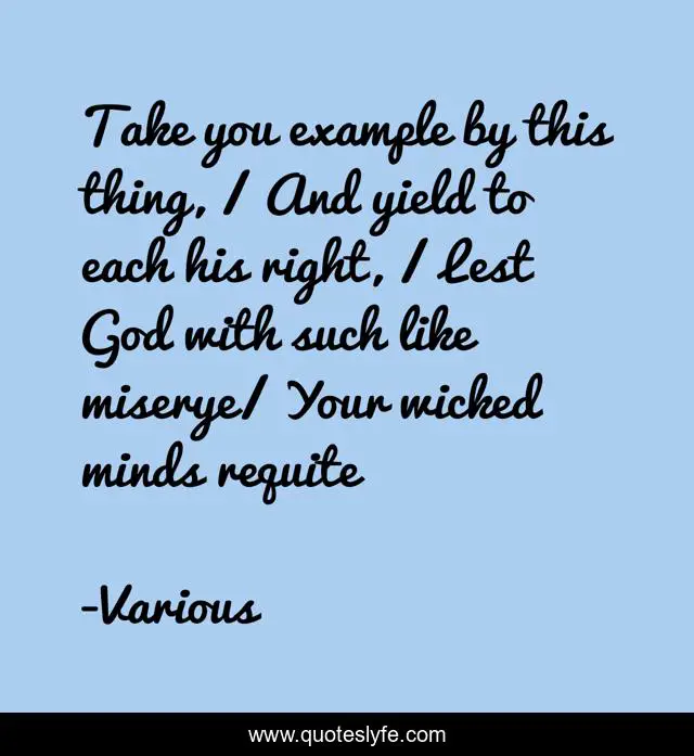 This page presents the quote "Take you example by this thing, / And yield to each his right, / Lest God with such like miserye/ Your wicked minds requite". Author of this quote is Various. .