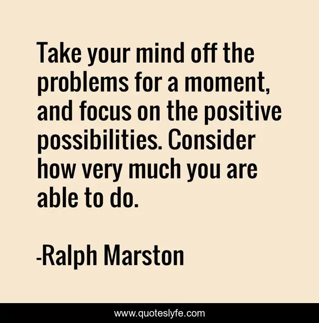 This page presents the quote "Take your mind off the problems for a moment, and focus on the positive possibilities. Consider how very much you are able to do.". Author of this quote is Ralph Marston. This quote is about problems, mind, focus,.