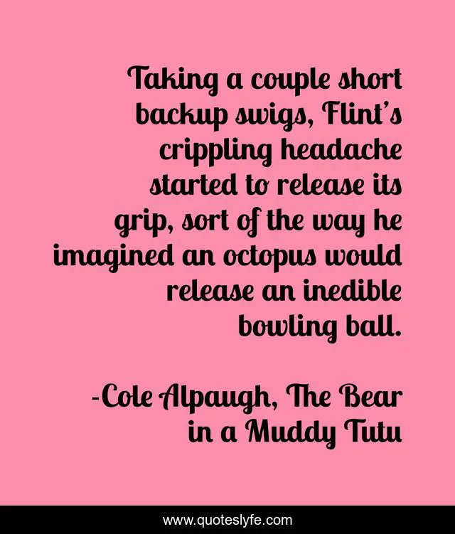 This page presents the quote "Taking a couple short backup swigs, Flint’s crippling headache started to release its grip, sort of the way he imagined an octopus would release an inedible bowling ball.". Author of this quote is Cole Alpaugh, The Bear in a Muddy Tutu. This quote is about drinking, circus, bowling, bear, headache,.