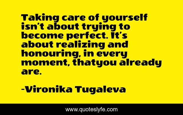 This page presents the quote "Taking care of yourself isn’t about trying to become perfect. It’s about realizing and honouring, in every moment, thatyou already are.". Author of this quote is Vironika Tugaleva. This quote is about perfect, self-love, self-awareness, perfection, self-care,.