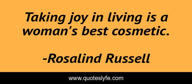 This page presents the quote "Taking joy in living is a woman's best cosmetic.". Author of this quote is Rosalind Russell. This quote is about joy, woman, best,.