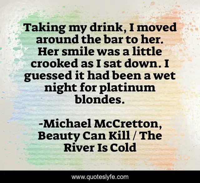 This page presents the quote "Taking my drink, I moved around the bar to her. Her smile was a little crooked as I sat down. I guessed it had been a wet night for platinum blondes.". Author of this quote is Michael McCretton, Beauty Can Kill / The River Is Cold. This quote is about drinking, noir, drunk,.