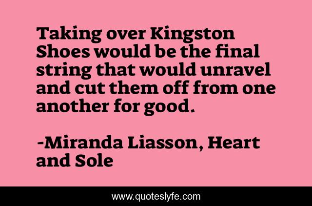 This page presents the quote "Taking over Kingston Shoes would be the final string that would unravel and cut them off from one another for good.". Author of this quote is Miranda Liasson, Heart and Sole. This quote is about series-romance, enemies-to-lovers, contemporary-romance, lighthearted,.