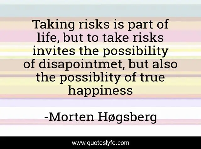 This page presents the quote "Taking risks is part of life, but to take risks invites the possibility of disapointmet, but also the possiblity of true happiness". Author of this quote is Morten Høgsberg. This quote is about happiness, life, love, risk, affection,.