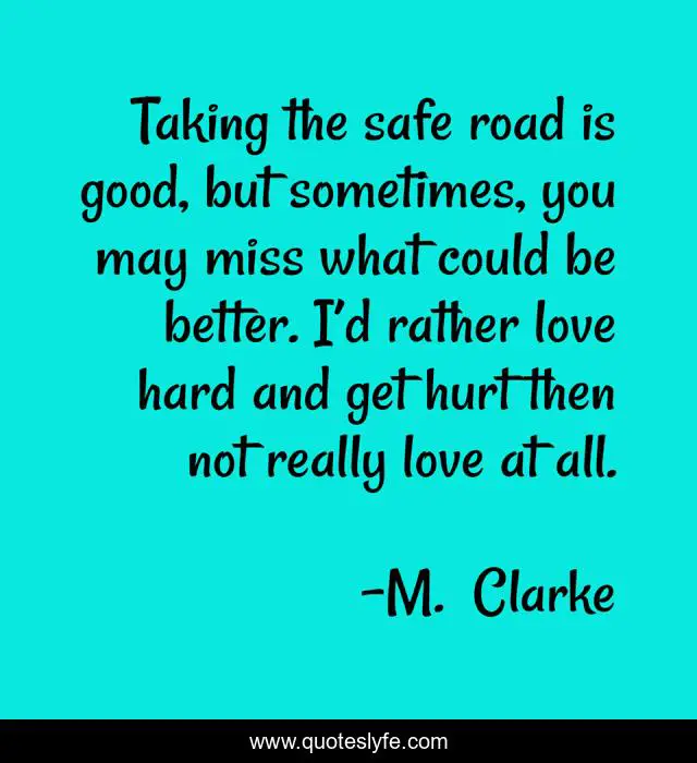 This page presents the quote "Taking the safe road is good, but sometimes, you may miss what could be better. I’d rather love hard and get hurt then not really love at all.". Author of this quote is M. Clarke. This quote is about new-adult, romance,.