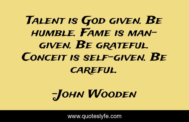 This page presents the quote "Talent is God given. Be humble. Fame is man-given. Be grateful. Conceit is self-given. Be careful.". Author of this quote is John Wooden. This quote is about humble, grateful, wisdom,.