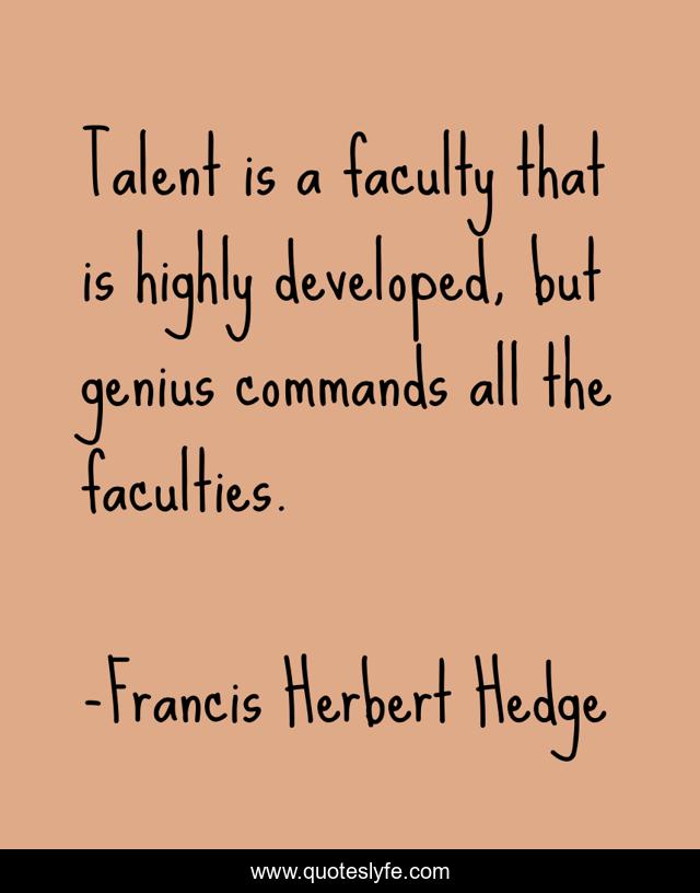 This page presents the quote "Talent is a faculty that is highly developed, but genius commands all the faculties.". Author of this quote is Francis Herbert Hedge. This quote is about genius, talent, faculty,.