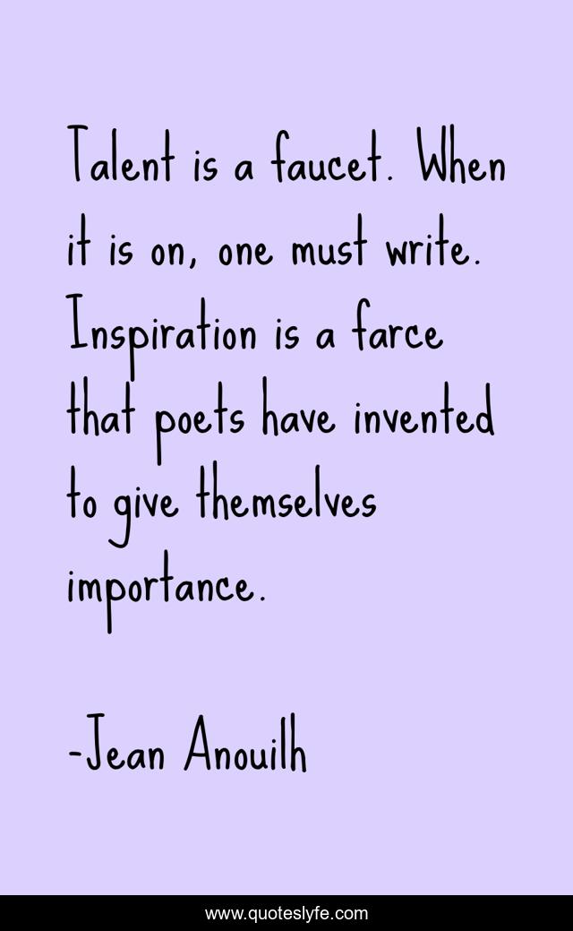 This page presents the quote "Talent is a faucet. When it is on, one must write. Inspiration is a farce that poets have invented to give themselves importance.". Author of this quote is Jean Anouilh. This quote is about inspiration, poetry, writing,.