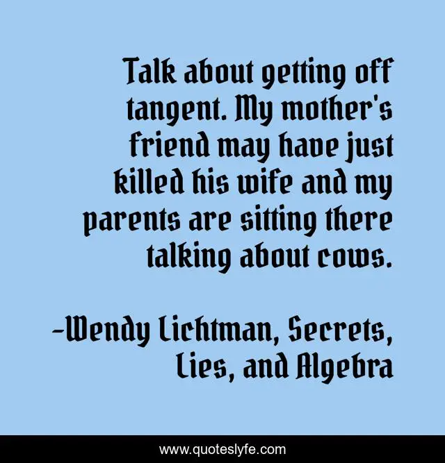 This page presents the quote "Talk about getting off tangent. My mother's friend may have just killed his wife and my parents are sitting there talking about cows.". Author of this quote is Wendy Lichtman, Secrets, Lies, and Algebra. This quote is about funny, comedy,.